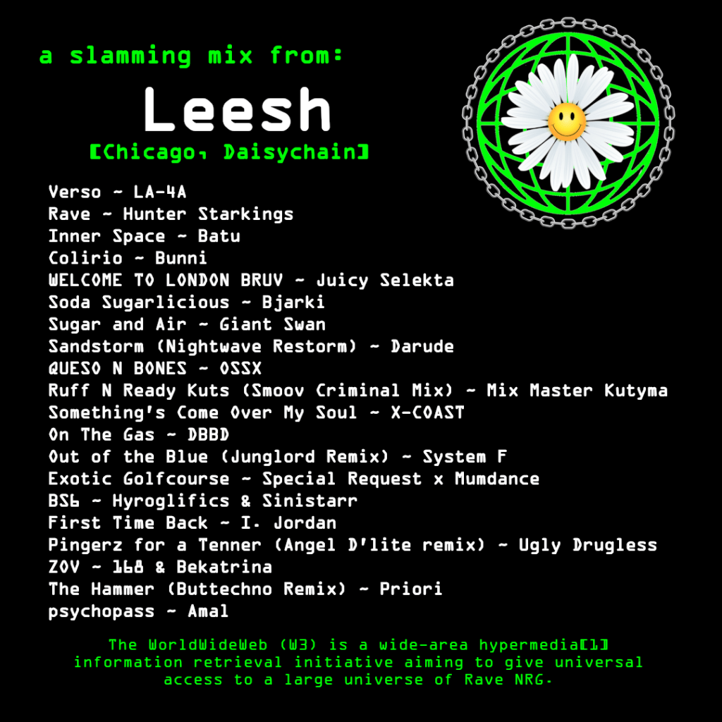 Leesh (@dj_leesh) comes hard and fast. In this live recording from a party at The Hideout in Chicago, expect speedy break-heavy trance-laden crushed up distortion, bumping in bass and nostalgic rave pingbacks.